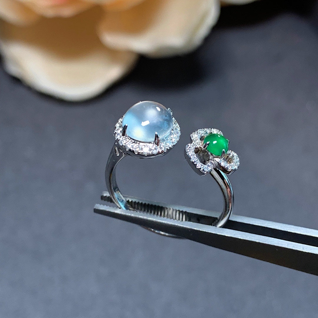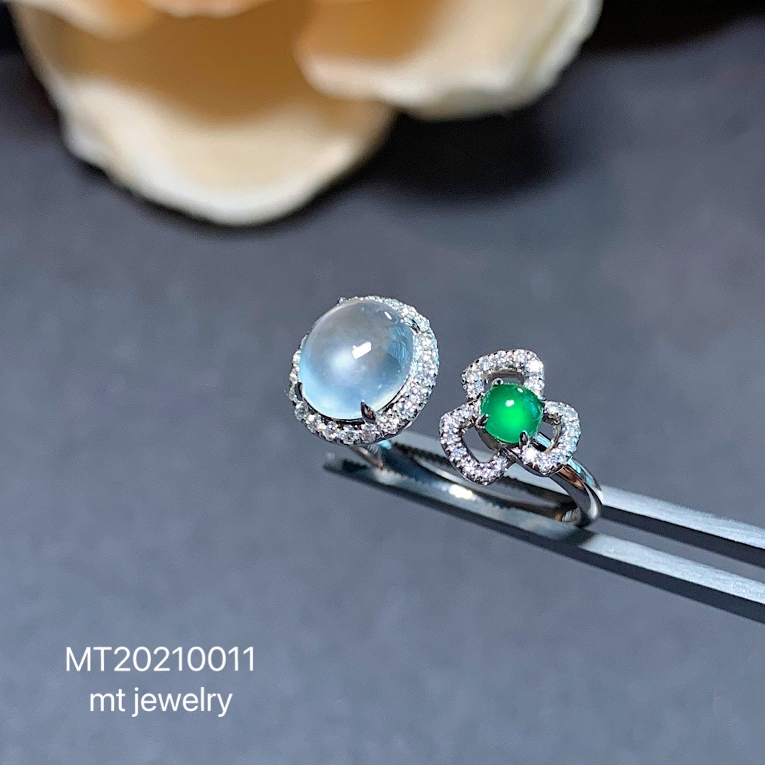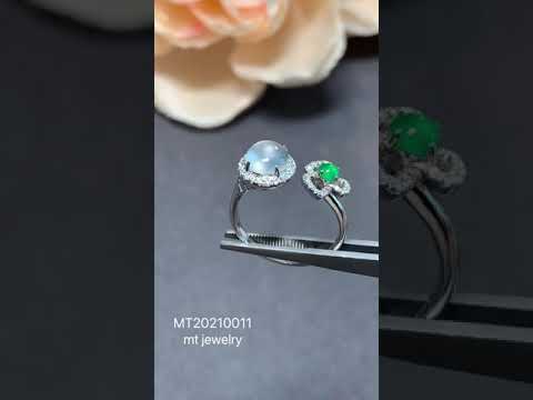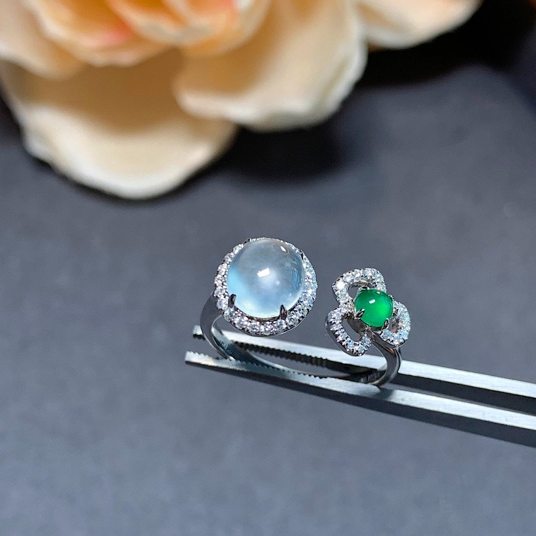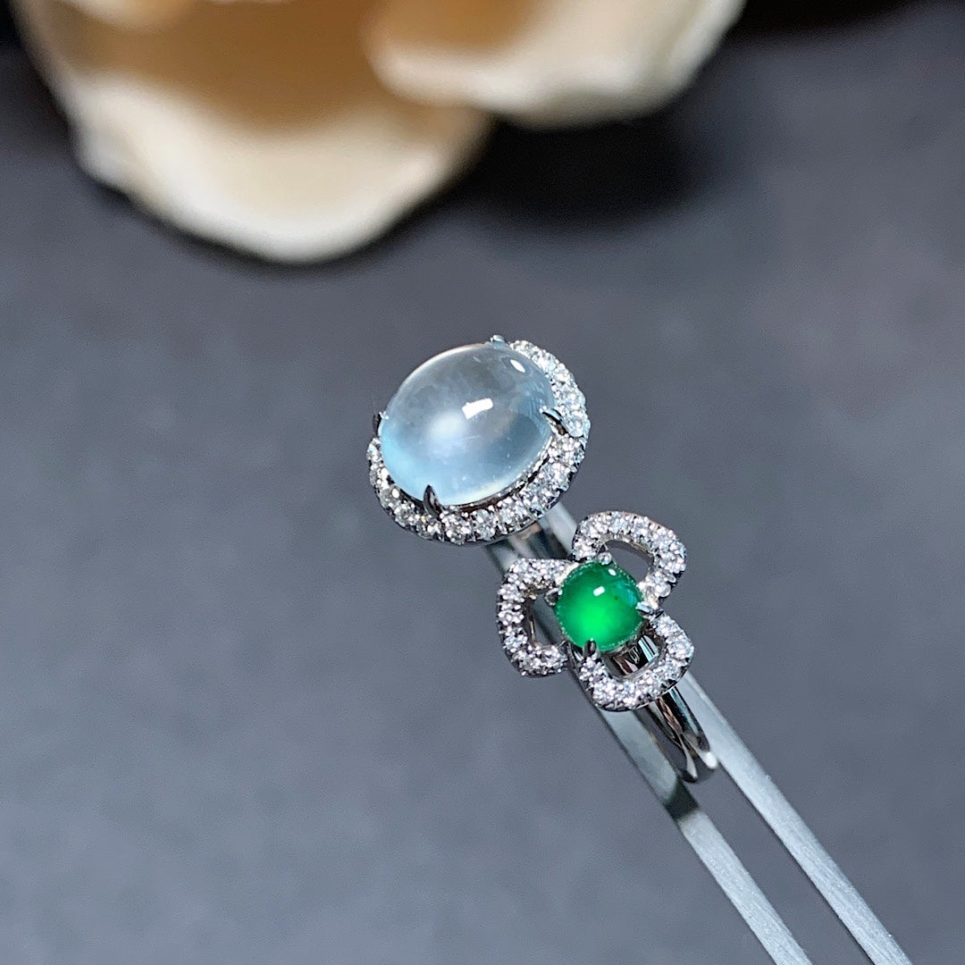 ☘️天然翡翠A货玻璃种蛋面+高冰绿蛋面戒指,种水特别好,荧光满满